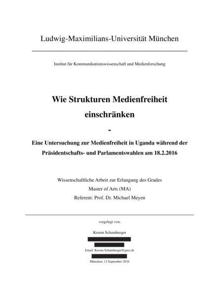 "Ugandische Eliten erwarten von Journalisten zu Wahlzeiten eine positive Berichterstattung. Kritik und Hinterfragung von Standpunkten werden nicht gerne gesehen. Die übermächtigen Ressourcen der Herrschenden werden dazu eingesetzt, diese Erwartungen zu erfüllen. Dementsprechend können Journalisten ihre Selbstverständnisse nicht realisieren, sondern passen sich den Erwartungen an. Diese Masterarbeit macht deutlich, dass die derzeitigen Strukturen des ugandischen Mediensystems das journalistische Können und damit die Medienfreiheit einschränken. Deshalb muss auch von staatlichen Akteuren oftmals kein direkter Druck durch polizeiliche oder juristische Verfolgung erzeugt werden. Der derzeitige Zustand der Arbeits- und Ausbildungsbedingungen, sowie die Eigentumsstrukturen reichen zur Disziplinierung aus." (Fazit, Seite 100)