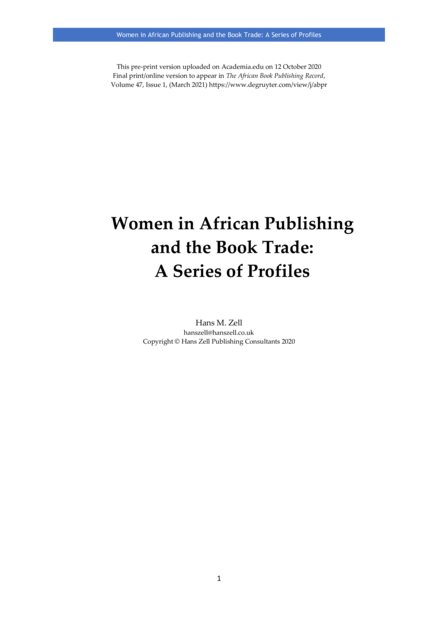 "The late Asenath Bole Odaga, one of the pioneers of women in publishing in Africa and founder of Lake Publishers & Enterprises Ltd in Kenya in 1983, in an account of her early experience as a publisher, wrote1 that she found it to be an uphill struggle initially, and was confronted by male colleagues who suggested that publishing was a complex business, best left to men, and that it might be rather more appropriate if she were to set up a restaurant instead of a publishing house! Happily, such blatantly chauvinist attitudes are now largely a thing of the past, and it would probably be true to say that much progress has been made in gender equality in African publishing in recent years. This has seen the emergence of a whole new generation of agile, visionary, and enterprising women publishers, as well as many other women who have provided leadership, and have made significant contributions in the African book world." (Abstract)
