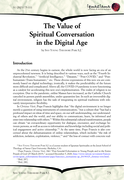 ulture has the phenomena of duality. On the one hand, people desire comm unication among people, especially in expressing or sharing their religious faith and spiritual beliefs, even though it is de-institutionalized or new formed; on the other hand, nevertheless, since the self in the communication becomes digitally networked, the risk of dehumanization and cognitive bias is still present. Based on Martin Buber’s theory of relationship, an authentic communication culture may be realized by a qualitative leap of relationship from “I-It” to “I-You” in the conversational structure, esteeming both otherness and reciprocity. The authentic relationship of “I-You” should transit to the ultimate and transcendental relationship of “Ieternal You.” At this point, this study paid particular attention to the value of spiritual conversation as a form of a dialogue between two or more people that involves sharing one’s personal experiences of finding God in daily life, and attentively focusing on one’s desires, dreams, and emotions." (General conclusion, page 106)