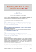 of 2018, a total of 141 records. Also included are a small number of articles and other documents published in 2017 or earlier, which have not hitherto been included in previous annual literature reviews, or in the Publishing, Books & Reading in SubSaharan Africa online database. The literature review covers books, chapters in books and edited collections, journal articles, Internet documents and reports, theses and dissertations, interviews, audio/video recordings and podcasts, as well as a number of blog postings, with their posting dates indicated." (Page 1)