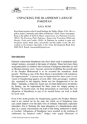 blasphemy law, a process analysed in terms of ‘lawfare’. Examining the interplay of legal regulation and the campaign against ‘deviant’ religion launched by conservative Muslim groups, the article tracks the affective consequences of this regulation, showing how the blasphemy law inspires civilians to investigate suspected cases of heresy. While blasphemy trials purportedly protect religion from insult and foster religious order, this article argues that religion lawfare breeds suspicion and divisions among citizens." (Abstract)