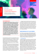 n abgewogen werden können, damit es mit dem gesellschaftlichen (Zusammen-)Leben weitergehen kann. Was dieser erweiterte Blick für den Journalismus bedeutet, wird anhand der zehn ausgewählten Beispiele für konstruktive Ansätze in der Berichterstattung zu ‚Corona‘ nachvollziehbar: Für unsere Gesellschaft geht es vor allem um eine sinnvolle Balance zwischen Lösungen, Engagement und Innovation. Der Journalismus übernimmt eine systemisch wichtige Schnittstellenfunktion, indem er genau über diese weltweiten Lösungen, Engagements und Innovationen berichtet – mit kritischer Distanz und respektvoll. Es mag ein wenig hart klingen, aber: Eine digitale Blütezeit des Journalismus, die sich sowohl in Wertschätzung als auch in Umsätzen auszahlt, ist noch in weiter Ferne, solange sich journalistische Praxis nicht aus sich selbst heraus finanziell tragen lässt. Nachrichtenangebote, insbesondere in Zeiten von ‚Corona‘, scheinen der Öffentlichkeit nicht gut zu dienen, wenn sie Dinge vereinfachen, verkürzen oder extrapolieren. Stattdessen sollten Journalist:innen den Mut und die Sensibilität aufbringen, sorgsamer zu differenzieren, Kontexte zu liefern und die Welt zu vermitteln, wie sie ist: komplex. Dass dies nicht auf Kosten der Verständlichkeit gehen darf, ist zweifelsfrei eine journalistische Herausforderung, aber eine, die Ehrgeiz wecken sollte. Konstruktive und lösungsorientierte Ansätze, wie sie derzeit Anwendung finden, werden daher irgendwann als Blaupause für die Medien der Zukunft dienen können." (Fazit und Asublick, Seite 71)