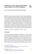 nine in-depth interviews (online) with broadcast journalists in 2020 and employed thematic analysis to address the study’s findings. The study found that the safety threats encountered by journalists during the COVID-19 outbreak include the risk of contracting the virus, financial insecurity, and emotional trauma, among others. To combat these safety threats, journalists were responsible for their safety; hence, they ensured adherence to safety protocols with little or no support from the media houses they worked for. The implication of these safety threats to journalism practice includes reduced work output, reduced dissemination of factual reports, low-quality stories, and the lack of in-depth and investigative news reports during the COVID-19 pandemic in Nigeria." (Abstract)