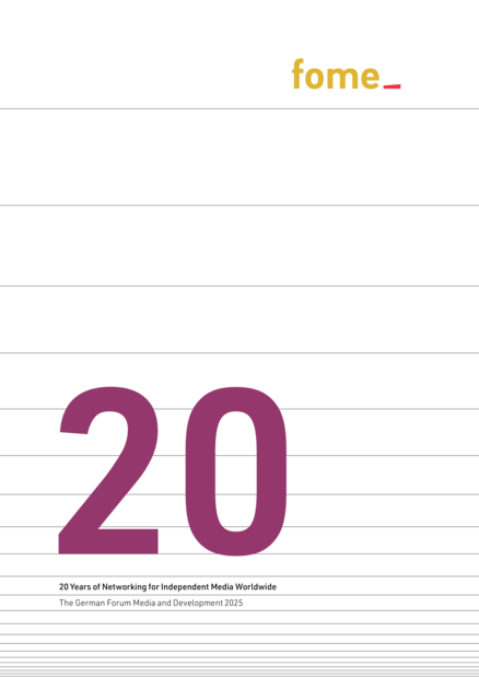 The challenges in media assistance, however, increased over these 20 years. Digital media caused the breakdown of traditional funding business models, and especially local communication spaces are becoming more vulnerable.Never before have so many journalists faced such severe threats — being murdered in war zones, imprisoned by authoritarian regimes, and subjected to hate speech and open threats on social media. Digital media serve as tools of hybrid warfare, and the ways in which propaganda and misinformation influence democratic elections and societal debates have increased. AI will further boost the potential of deepfakes. Therefore, combating disinformation remains a key focus of German media support. However, fighting disinformation also involves backing credible media organisations and making independent journalists as resilient as possible against various forms of attack. It also involves identifying the most effective ways of publishing and accessing information, as well as exploring the potential of AI in journalists' professional environments. The most effective approaches to achieve this have been the subject of learning and discussion in the fome network during the last 20 years, and they will be explored within the fome network over the next 20 years. Some of the member organisations featured in this brochure highlight one of their projects, which they implement with media professionals in the so-called Global South. The individual articles also demonstrate the diversity of the member organisations and their various areas of activity across different regions of the world." (Introduction by Sofie Jannusch)