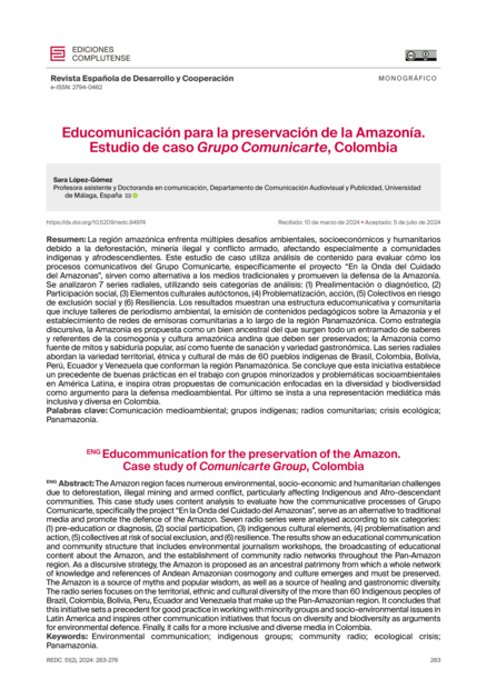 "La región amazónica enfrenta múltiples desafíos ambientales, socioeconómicos y humanitarios debido a la deforestación, minería ilegal y conflicto armado, afectando especialmente a comunidades indígenas y afrodescendientes. Este estudio de caso utiliza análisis de contenido para evaluar cómo los procesos comunicativos del Grupo Comunicarte, específicamente el proyecto “En la Onda del Cuidado del Amazonas”, sirven como alternativa a los medios tradicionales y promueven la defensa de la Amazonía. Se analizaron 7 series radiales, utilizando seis categorías de análisis: (1) Prealimentación o diagnóstico, (2) Participación social, (3) Elementos culturales autóctonos, (4) Problematización, acción, (5) Colectivos en riesgo de exclusión social y (6) Resiliencia. Los resultados muestran una estructura educomunicativa y comunitaria que incluye talleres de periodismo ambiental, la emisión de contenidos pedagógicos sobre la Amazonía y el establecimiento de redes de emisoras comunitarias a lo largo de la región Panamazónica. Como estrategia discursiva, la Amazonía es propuesta como un bien ancestral del que surgen todo un entramado de saberes y referentes de la cosmogonía y cultura amazónica andina que deben ser preservados; la Amazonía como fuente de mitos y sabiduría popular, así como fuente de sanación y variedad gastronómica. Las series radiales abordan la variedad territorial, étnica y cultural de más de 60 pueblos indígenas de Brasil, Colombia, Bolivia, Perú, Ecuador y Venezuela que conforman la región Panamazónica. Se concluye que esta iniciativa establece un precedente de buenas prácticas en el trabajo con grupos minorizados y problemáticas socioambientales en América Latina, e inspira otras propuestas de comunicación enfocadas en la diversidad y biodiversidad como argumento para la defensa medioambiental. Por último se insta a una representación mediática más inclusiva y diversa en Colombia." (Resumen)