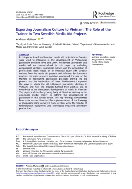 "In this paper, I explored how two media aid projects from Sweden were used to intervene in the development of Vietnamese journalism between 1993 and 2007. Vietnamese journalism and media aid are contextualized in this paper by unfolding pedagogical ideology, journalistic culture, and the negotiation of professional ideals. Based on an interview study with Swedish trainers from the media aid projects and informed by document analysis, the main research question concerned the role of the trainers in negotiating journalistic practices during the aid projects and the implications of these. Furthermore, I explored the ways in which the aid influenced journalistic ideology in Vietnam, and how the projects fulfilled their political aim to contribute to the democratic development of media in Vietnam. The paper adds to the growing body of literature seeking to de-colonialize media theory to rethink the development of journalism in the Global South. The key findings demonstrate how social norms disrupted the implementation of the ideology of journalism being conveyed from Sweden, while the transfer of technological equipment and knowledge impacted journalism production." (Abstract)