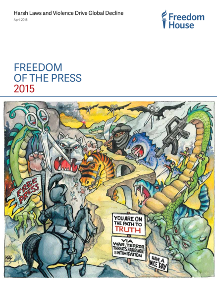 "Global press freedom declined in 2014 to its lowest point in more than 10 years. The rate of decline also accelerated drastically, with the global average score suffering its largest one-year drop in a decade. The share of the world’s population that enjoys a Free press stood at 14 percent, meaning only one in seven people live in countries where coverage of political news is robust, the safety of journalists is guaranteed, state intrusion in media affairs is minimal, and the press is not subject to onerous legal or economic pressures." (Page 1)