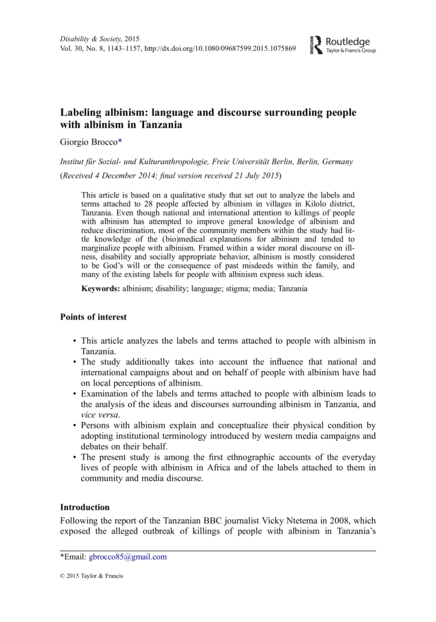 "This article is based on a qualitative study that set out to analyze the labels and terms attached to 28 people affected by albinism in villages in Kilolo district, Tanzania. Even though national and international attention to killings of people with albinism has attempted to improve general knowledge of albinism and reduce discrimination, most of the community members within the study had little knowledge of the (bio)medical explanations for albinism and tended to marginalize people with albinism. Framed within a wider moral discourse on illness, disability and socially appropriate behavior, albinism is mostly considered to be God’s will or the consequence of past misdeeds within the family, and many of the existing labels for people with albinism express such ideas." (Abstract)