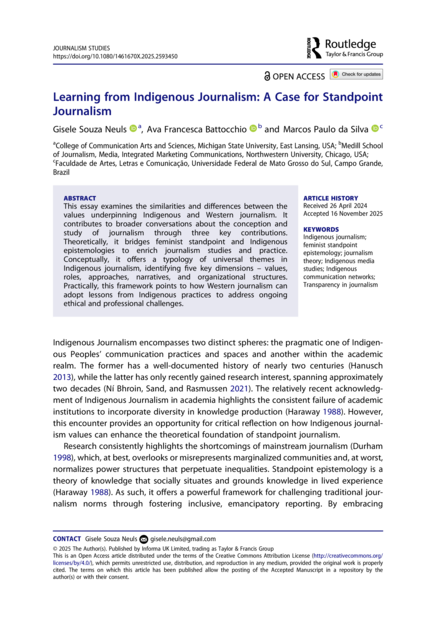 "This essay examines the similarities and differences between the values underpinning Indigenous and Western journalism. It contributes to broader conversations about the conception and study of journalism through three key contributions. Theoretically, it bridges feminist standpoint and Indigenous epistemologies to enrich journalism studies and practice. Conceptually, it offers a typology of universal themes in Indigenous journalism, identifying five key dimensions – values, roles, approaches, narratives, and organizational structures. Practically, this framework points to how Western journalism can adopt lessons from Indigenous practices to address ongoing ethical and professional challenges." (Abstract)