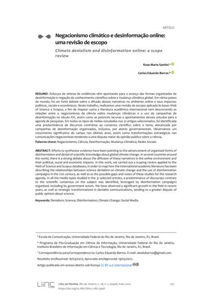 "Esforços de síntese de evidências vêm apontando para o avanço das formas organizadas de desinformação e negação do conhecimento científico sobre a mudança climática global. Em vários países do mundo, há um forte debate sobre a difusão dessas narrativas no ambiente online e seus impactos políticos, sociais e econômicos. Neste trabalho, realizamos uma revisão de escopo aplicada às bases Web of Science e Scopus, a fim de mapear como a literatura acadêmica internacional vem descrevendo as relações entre o negacionismo da ciência sobre mudanças climáticas e o uso de campanhas de desinformação no século XXI, assim como as possíveis lacunas e apontamentos desses estudos para a agenda de pesquisas. Em todos os tipos de mídias estudados nos 31 artigos selecionados, foi identificada uma predominância de discursos contrários ao consenso científico sobre o tema, alavancada por campanhas de desinformação organizadas, inclusive, por atores governamentais. Observamos um crescimento significativo do campo nos últimos anos, assim como transformações estratégicas nas comunicações negacionistas tendendo a uma disputa maior da opinião pública sobre a ciência." (Resumo)