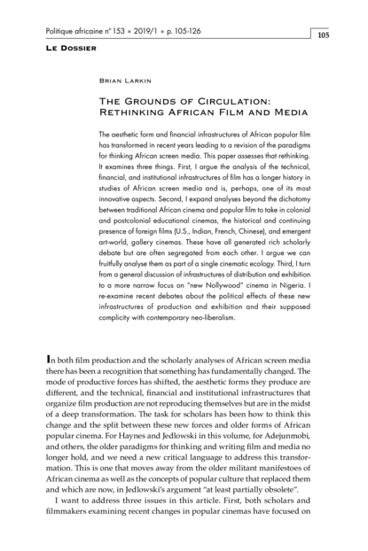 "The aesthetic form and financial infrastructures of African popular film has transformed in recent years leading to a revision of the paradigms for thinking African screen media. This paper assesses that rethinking. It examines three things. First, I argue the analysis of the technical, financial, and institutional infrastructures of film has a longer history in studies of African screen media and is, perhaps, one of its most innovative aspects. Second, I expand analyses beyond the dichotomy between traditional African cinema and popular film to take in colonial and postcolonial educational cinemas, the historical and continuing presence of foreign films (U.S., Indian, French, Chinese), and emergent art-world, gallery cinemas. These have all generated rich scholarly debate but are often segregated from each other. I argue we can fruitfully analyse them as part of a single cinematic ecology. Third, I turn from a general discussion of infrastructures of distribution and exhibition to a more narrow focus on “new Nollywood” cinema in Nigeria. I re-examine recent debates about the political effects of these new infrastructures of production and exhibition and their supposed complicity with contemporary neo-liberalism." (Abstract)